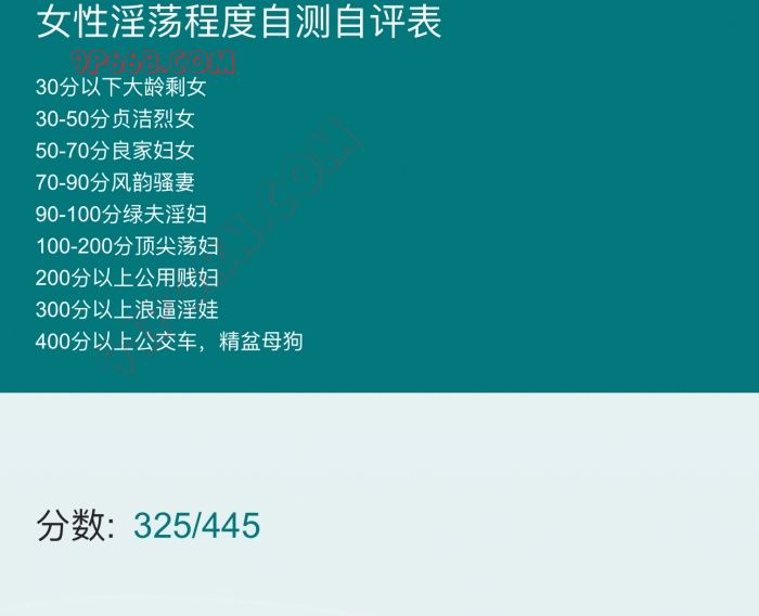 老婆测了正好得90分,不知道她属于风韵骚妻还是绿夫淫妇了。老婆换下来的一条内裤放了好几天了也不洗,难道等着我给她洗呢?